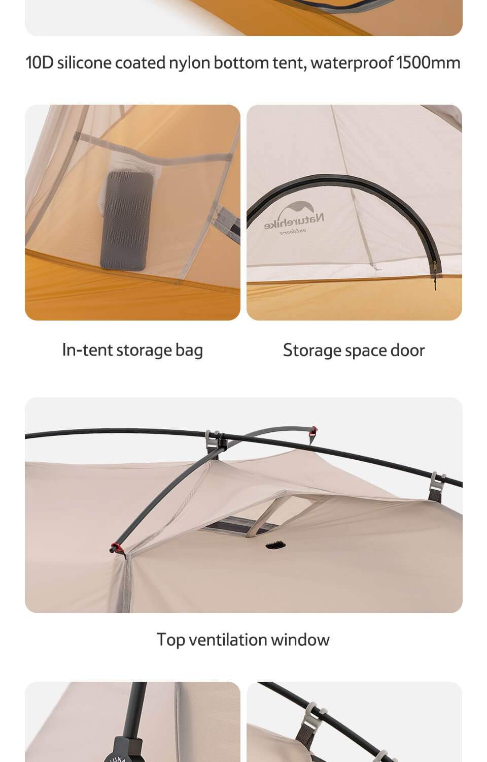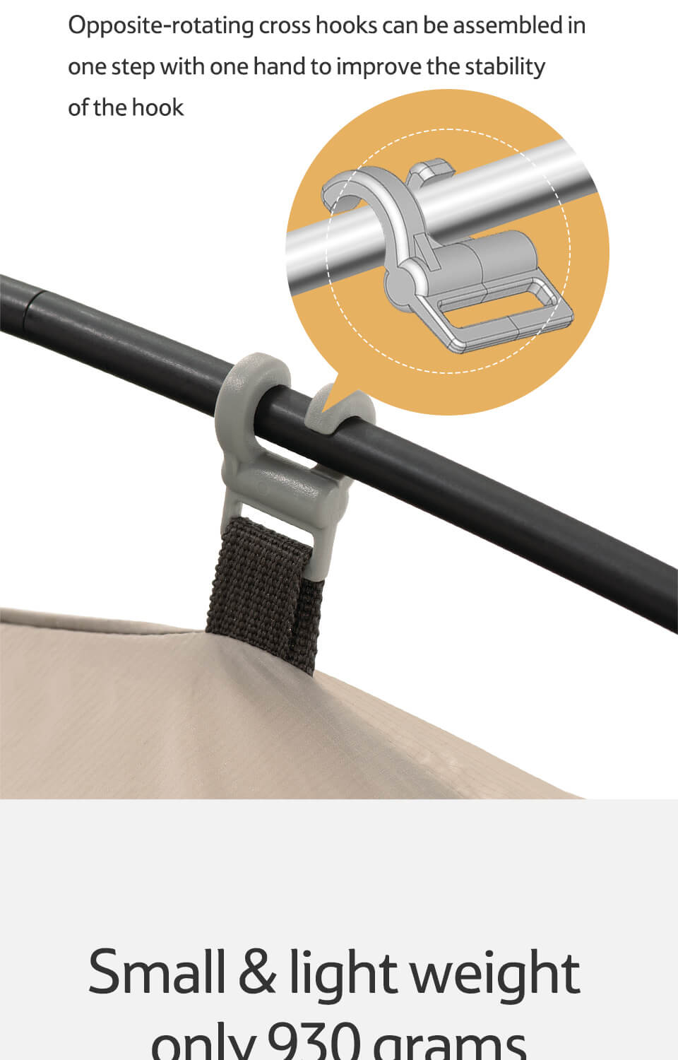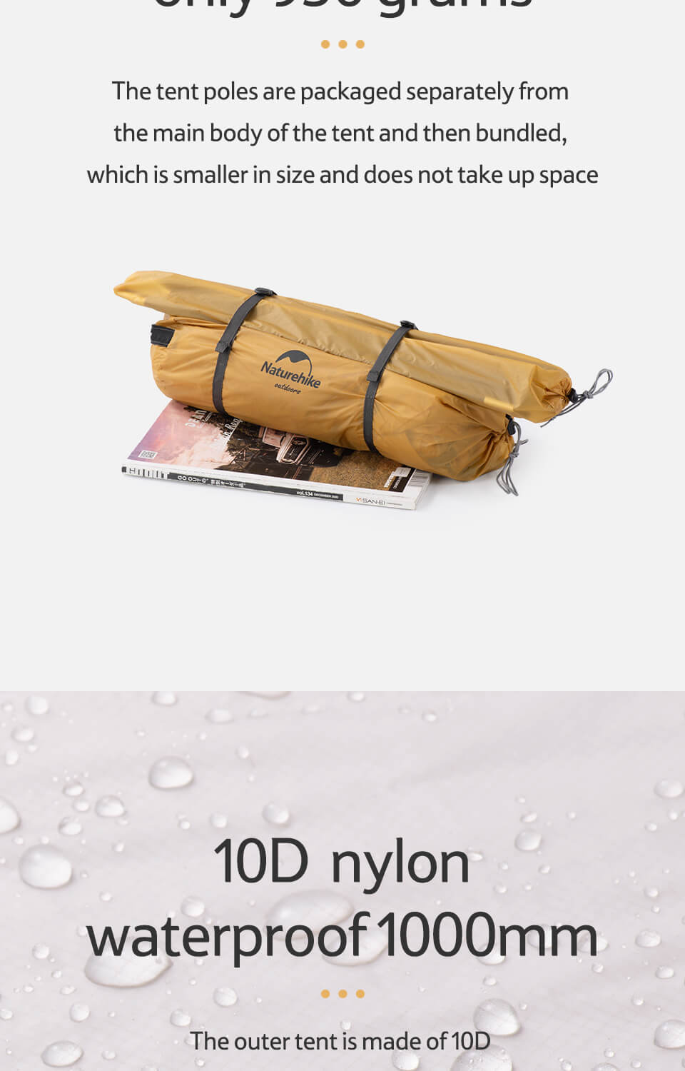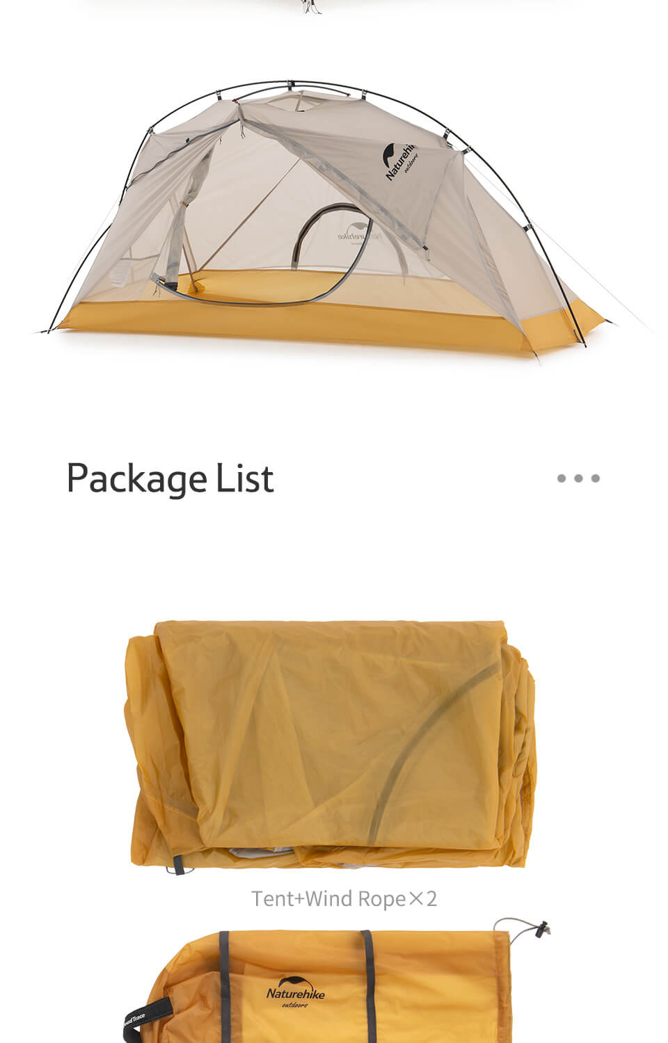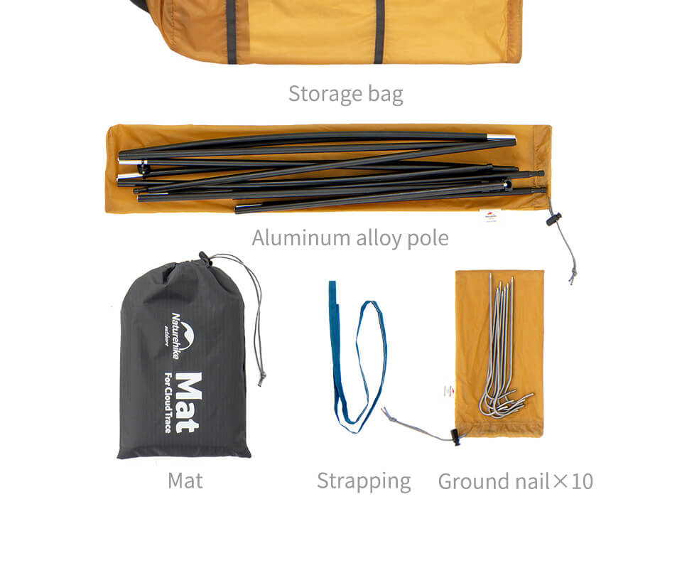 Packliste: Zelt / Integrierte Zeltstange aus Aluminiumlegierung 7001 (ca. φ8,5 mm) / 10 Bodennägel / 2 Windseile / Spezielles Bodentuch / Aufbewahrungstasche