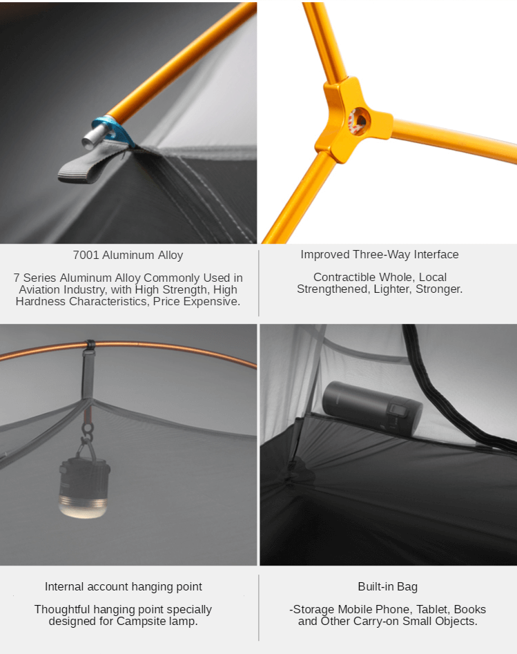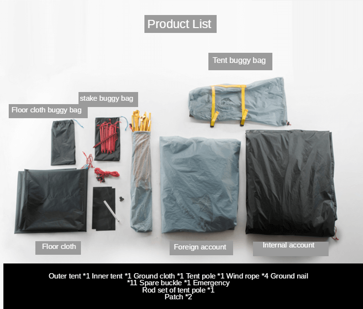 Fly*1, tente intérieure*1, sac de rangement pour tente*1, empreinte de pas*1, poteau*1, piquets*11, sac de rangement pour piquets*1, corde à vent*4, boucle de suspension*1, tube de réparation pour poteau*1, patch de réparation thermique*2