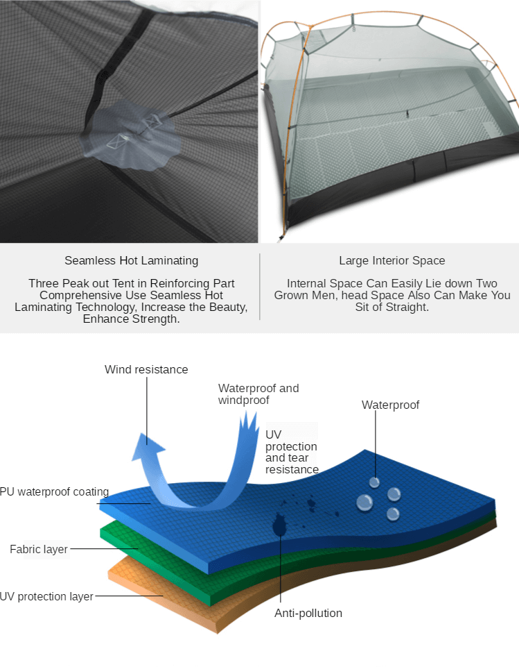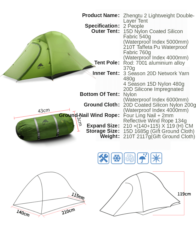 Tente de camping ultralégère 3F UL GEAR ZhengTu 2 15D en silicone enduit 3-4 saisons pour 2 personnes, tente d'extérieur anti-vent