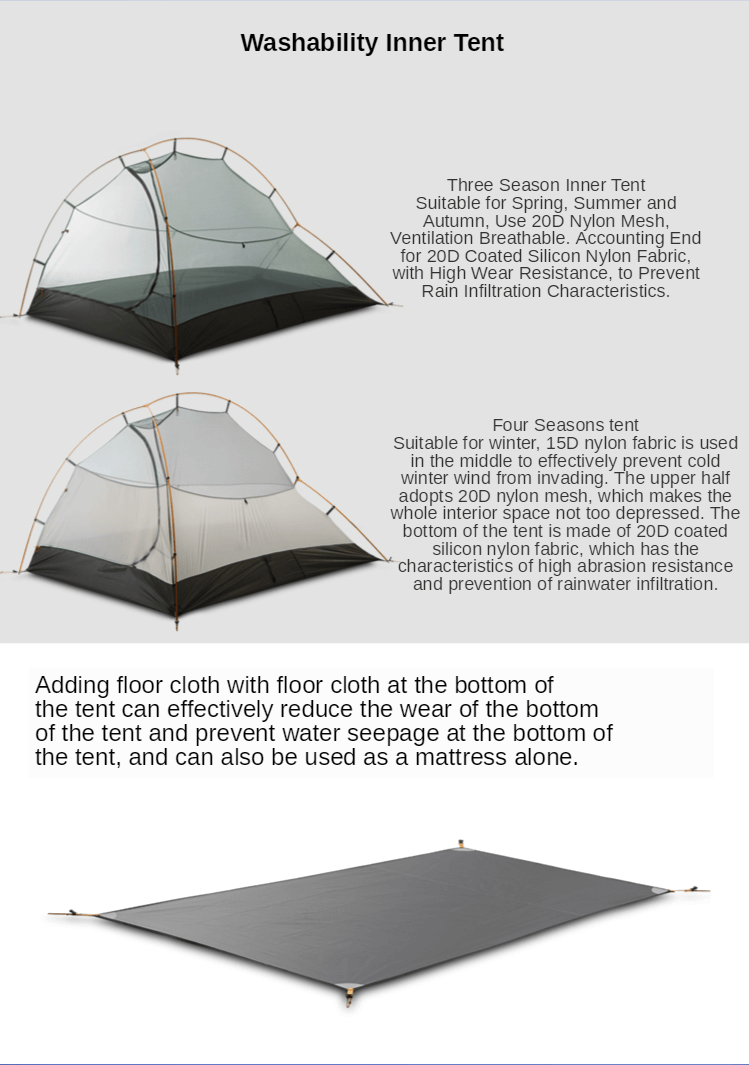 Tente intérieure : 3 saisons : maille 20 D / 4 saisons : nylon 15 D
