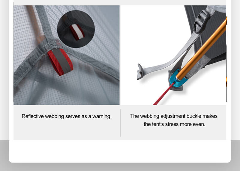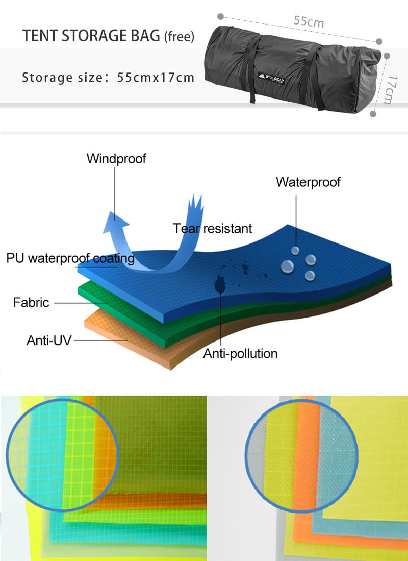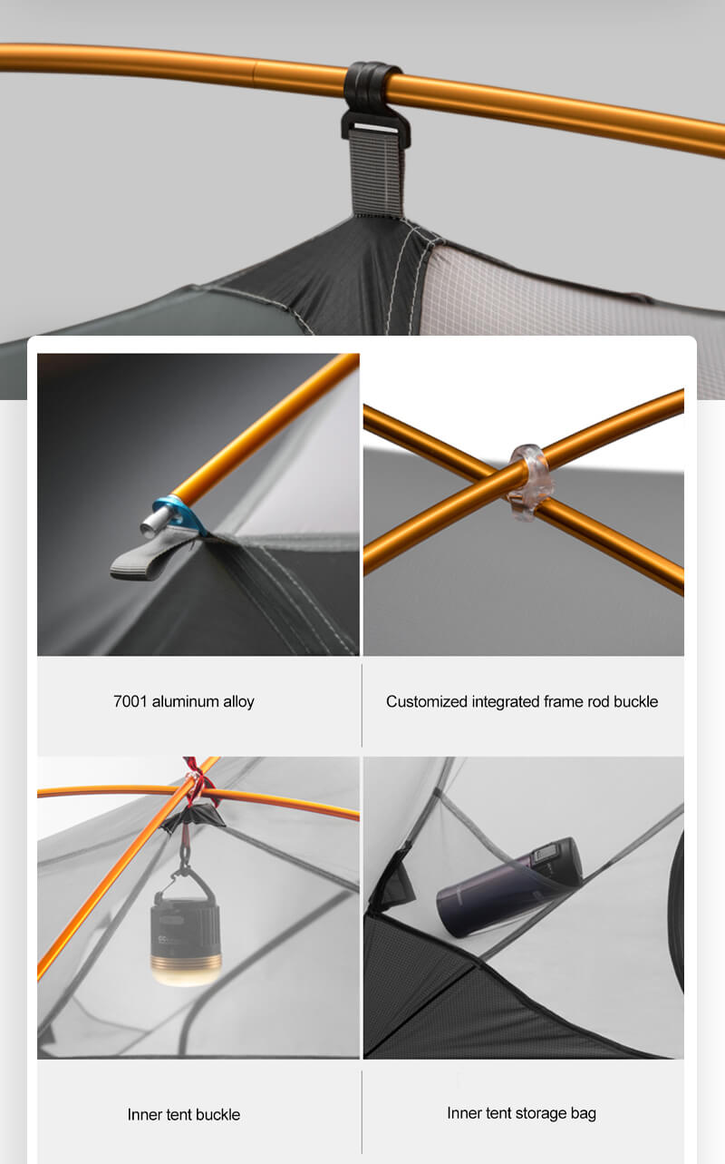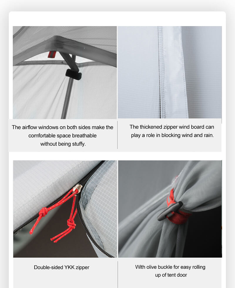 Fly*1, tente intérieure*1, sac de rangement pour tente*1, empreinte de pas*1, poteau*1, piquets*12, sac de rangement pour piquets*1, corde à vent*6, boucle de suspension*1, tube de réparation pour poteau*1, patch de réparation thermique*2